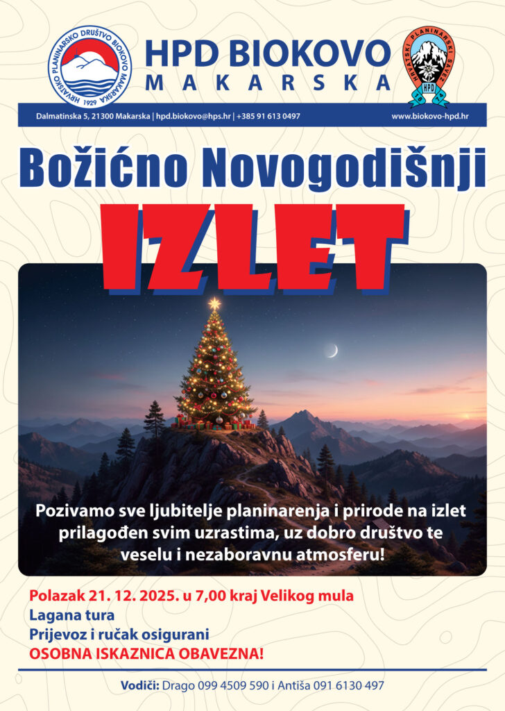 Pozivamo sve ljubitelje planinarenja i prirode na izlet prilagođen svim uzrastima, uz dobro društvo te veselu i nezaboravnu atmosferu! Polazak 21. 12. 2025. u 7,00 kraj Velikog mula Lagana tura Prijevoz i ručak osigurani OSOBNA ISKAZNICA OBAVEZNA! Vodiči: Drago 099 4509 590 i Antiša 091 6130 497