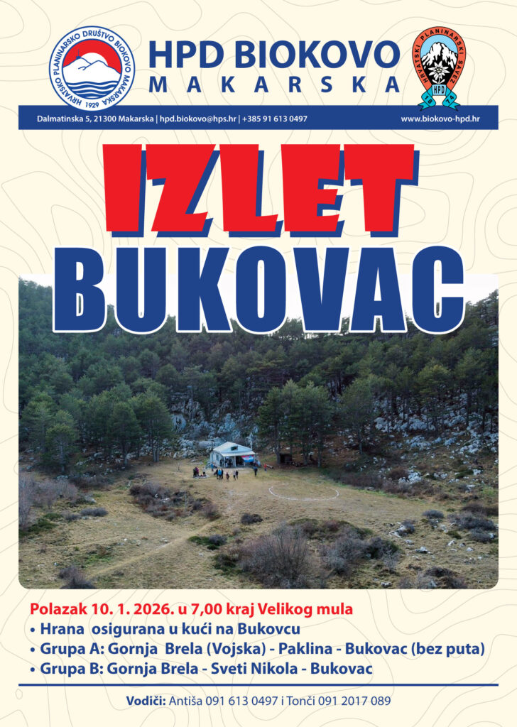 Polazak 10. 1. 2026. u 7,00 kraj Velikog mulaHrana osigurana u kući na Bukovcu Grupa A: Gornja Brela (Vojska) – Paklina – Bukovac (bez puta)Grupa B: Gornja Brela – Sveti Nikola – Bukovac Vodiči: Antiša 091 613 0497 i Tonči 091 2017 089