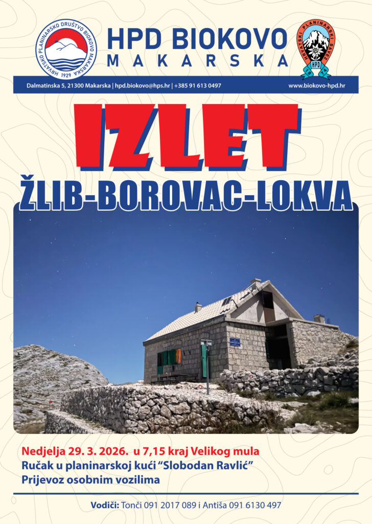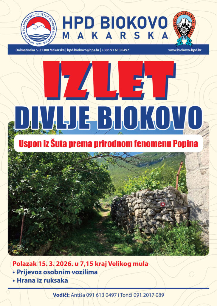 Polazak: Nedjelja 29. 3. 2026. u 7,15 kraj Velikog mula Ručak u planinarskoj kući “Slobodan Ravlić” Prijevoz osobnim vozilima Vodiči: Tonči 091 2017 089 i Antiša 091 6130 497