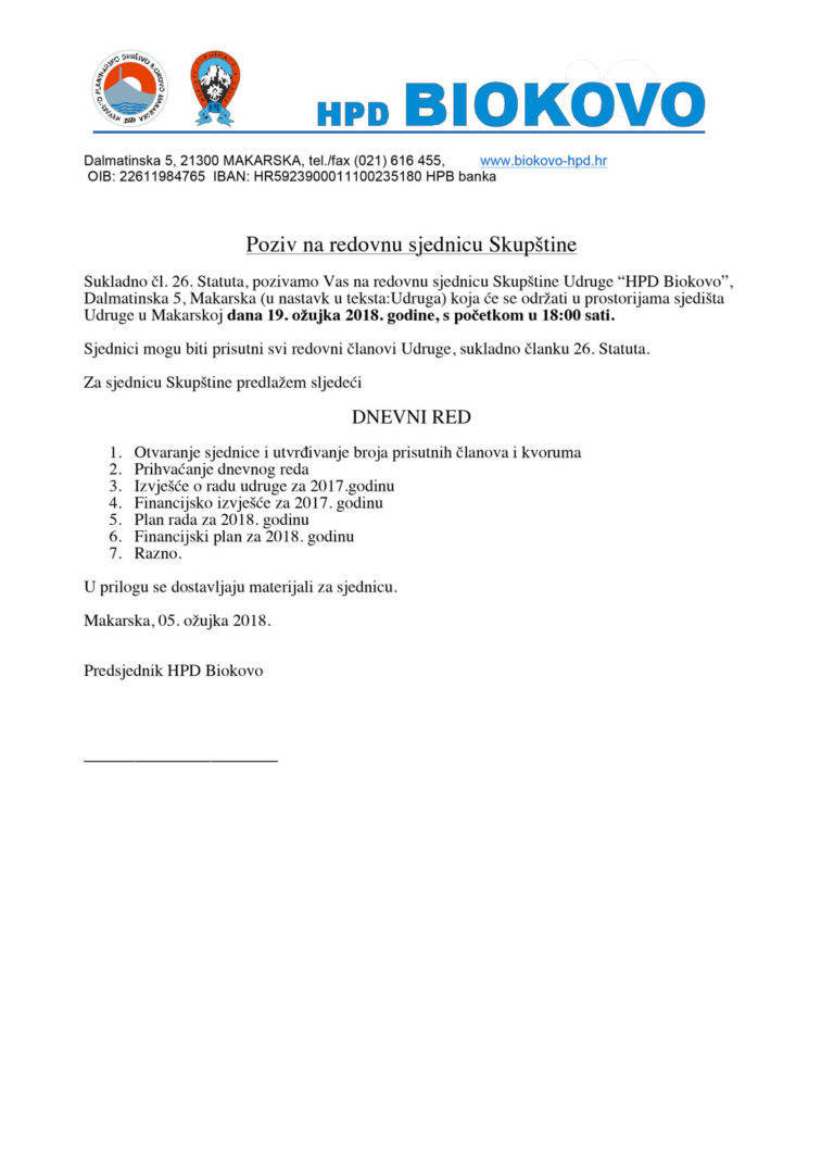 Sukladno čl. 26. Statuta, pozivamo Vas na redovnu sjednicu Skupštine Udruge “HPD Biokovo”,